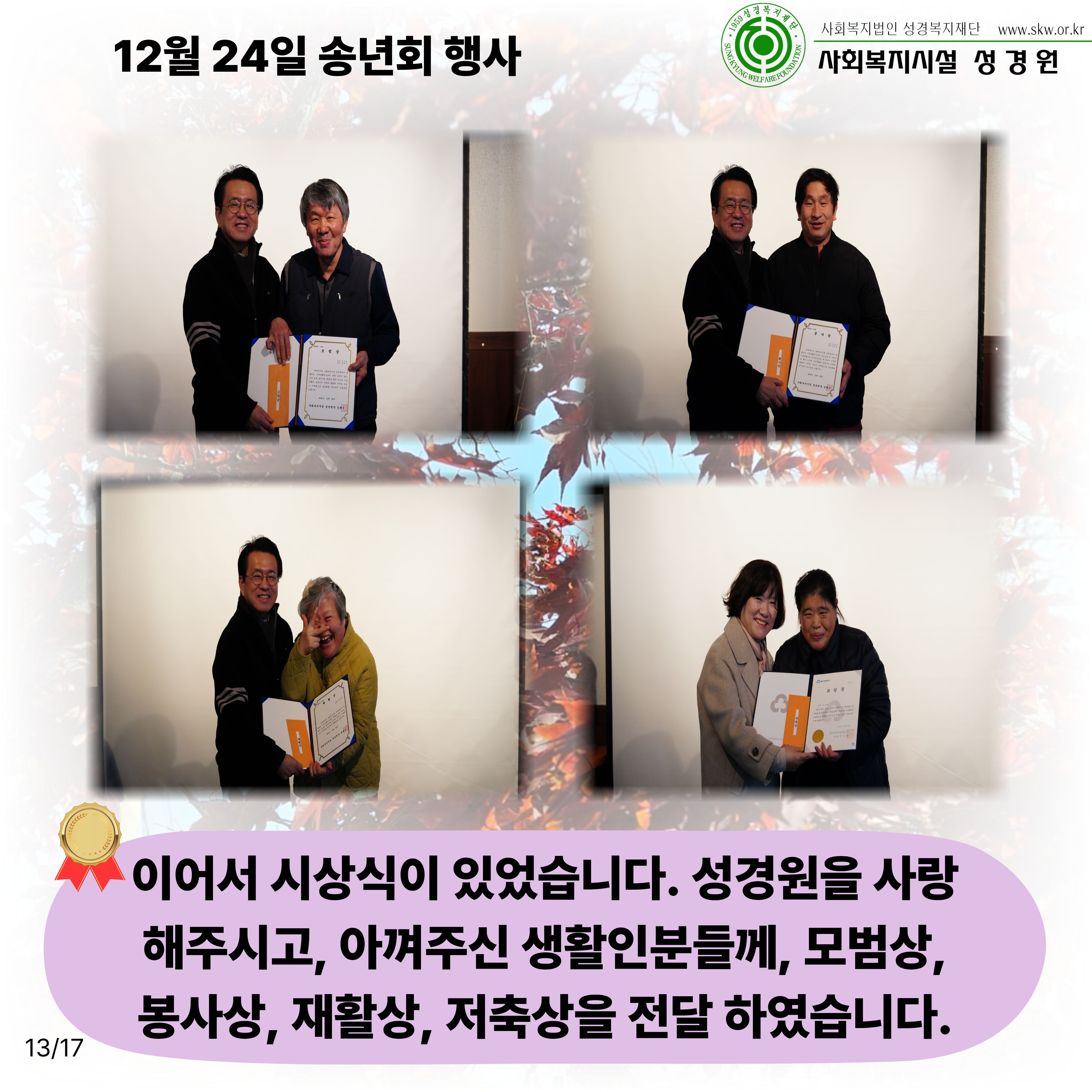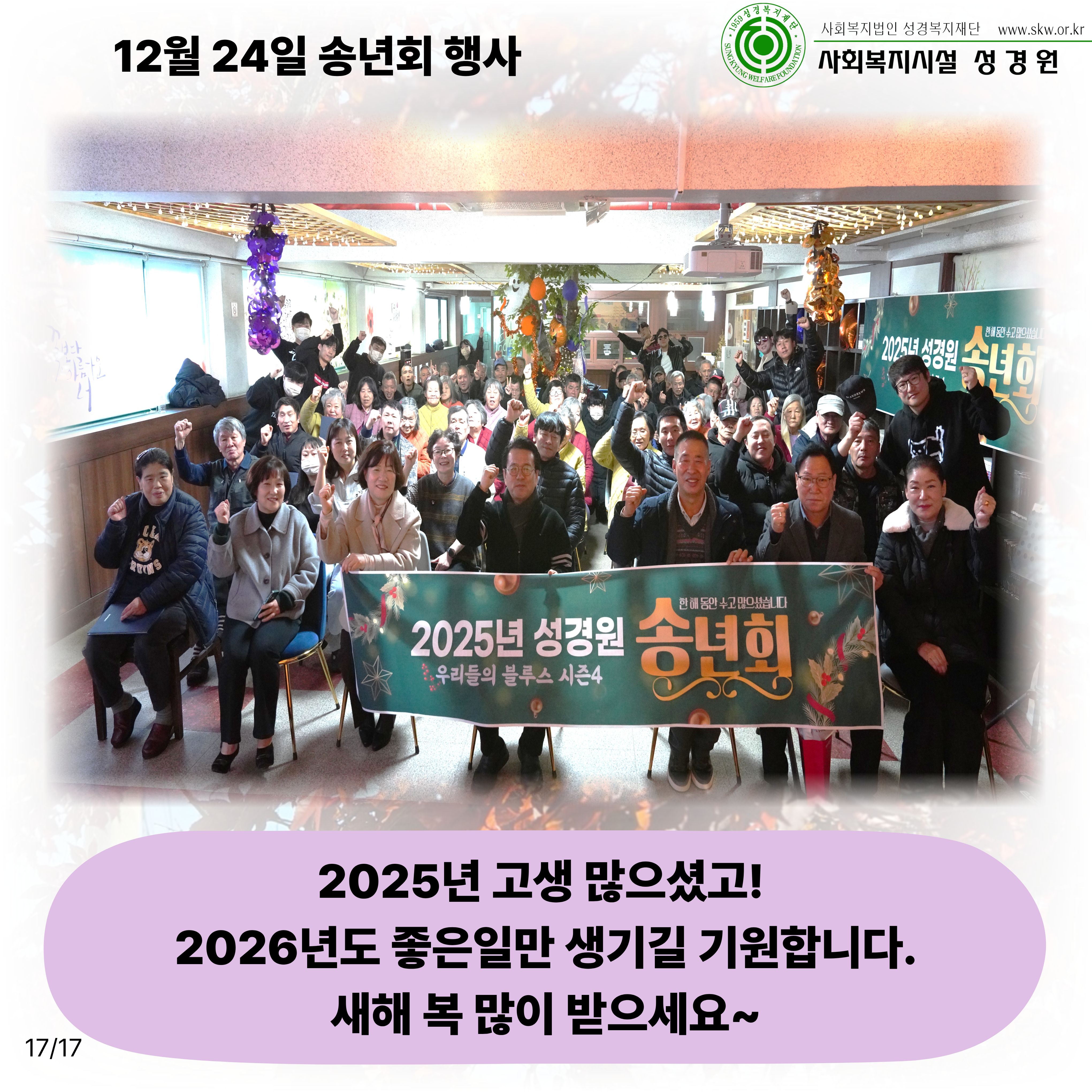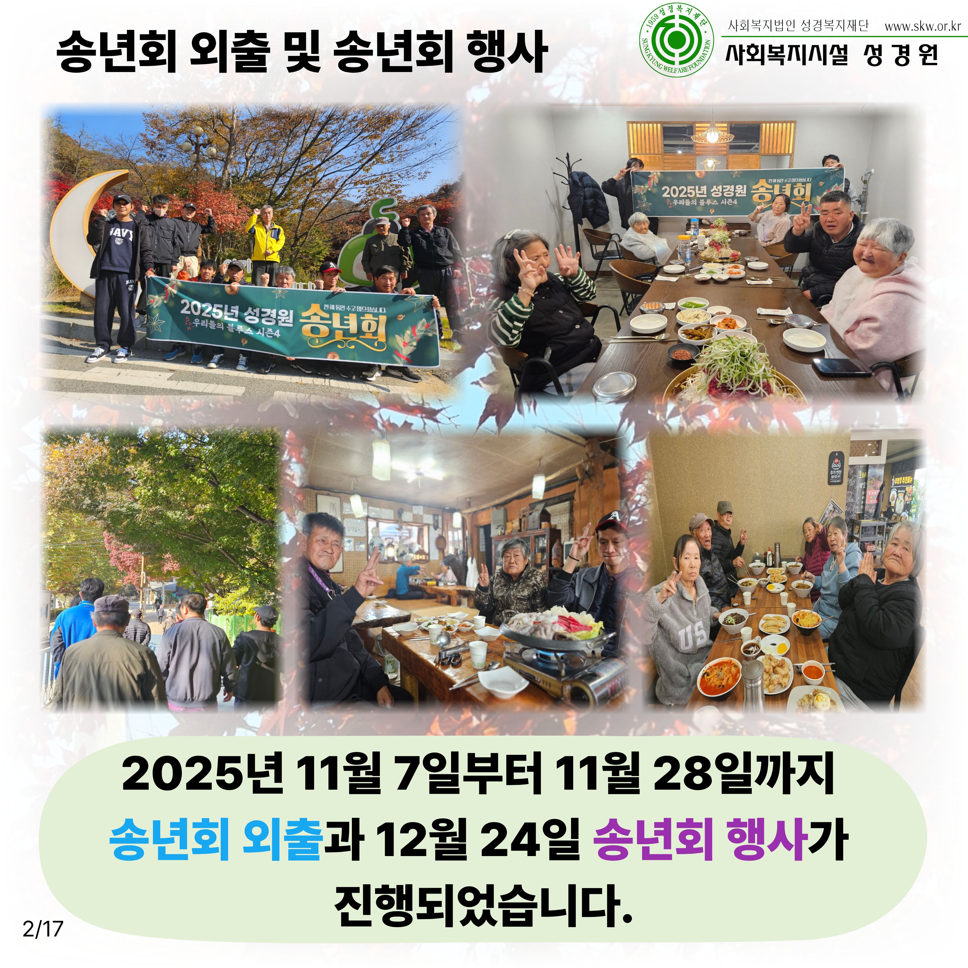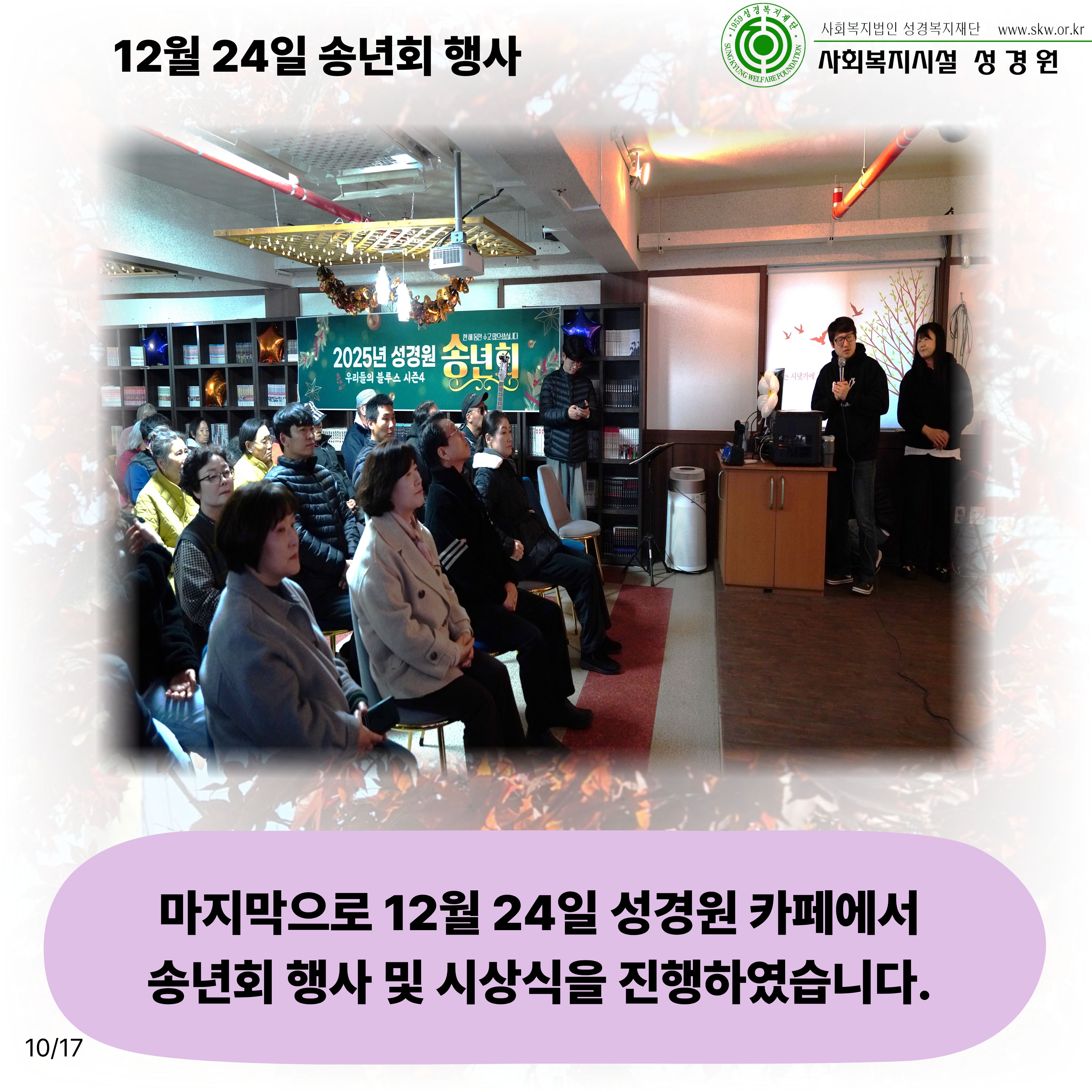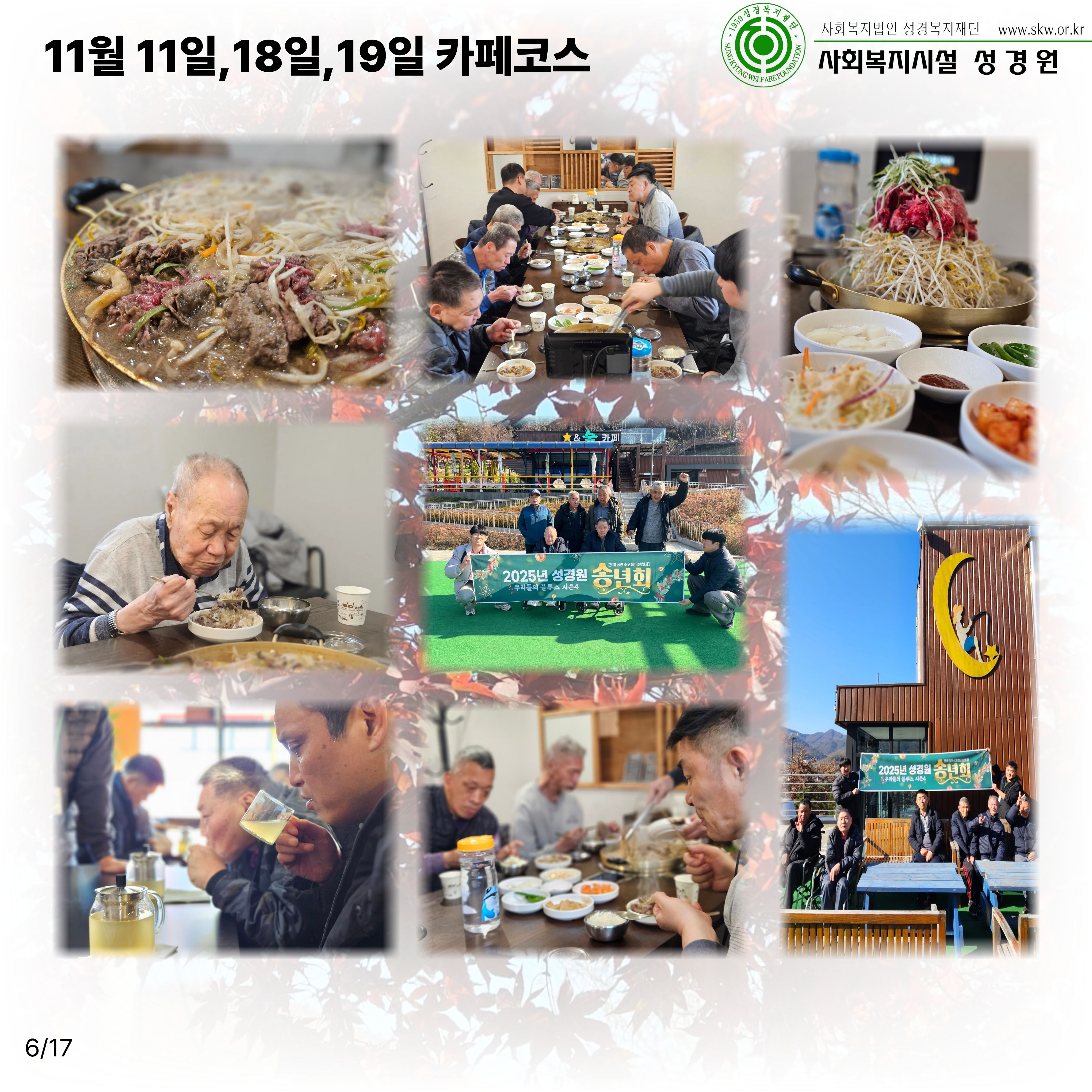 송년회 외출일시: 11월 7일~28일 총 7회차송년회 행사일시: 12월 24일장소: 성경원 카페내용: 성경원 송년회 외출과 송년회 행사를 진행하였습니다.2025년 고생 많으셨고, 2026년도 힘차게 달려나가시길 기원합니다!