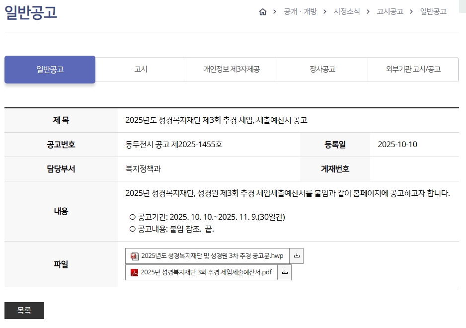 2025년도 성경복지재단 제3회 추경 세입, 세출예산서 공고