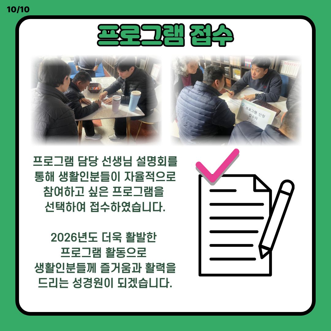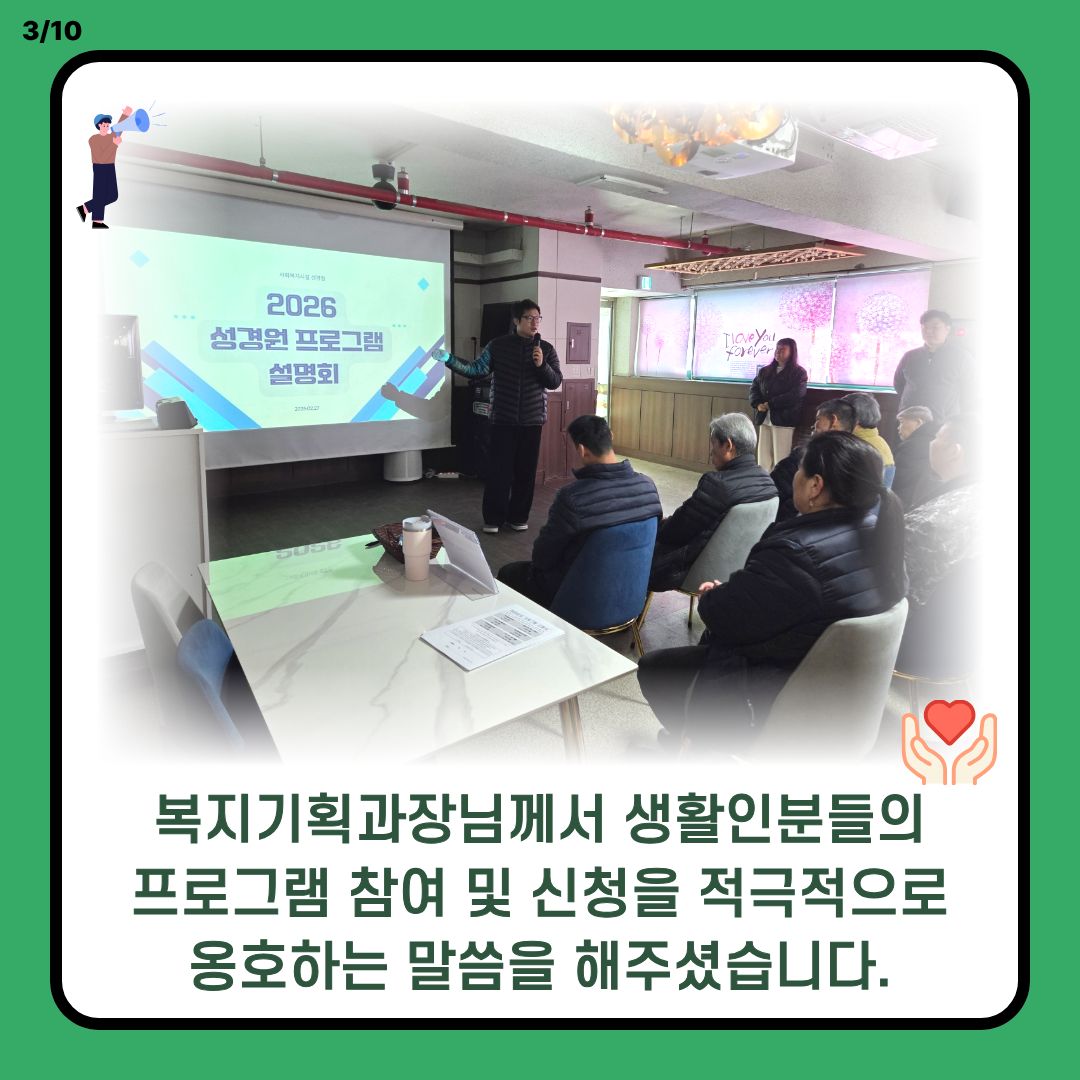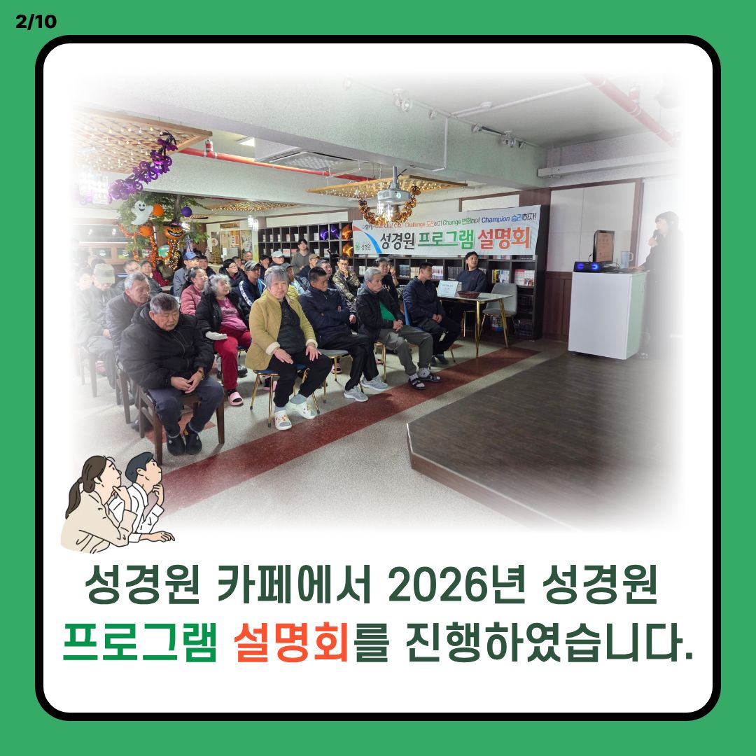 일시: 2026년 2월 27일 장소: 성경원 위드카페 내용: 성경원 위드카페에서 프로그램 설명회를 진행하였습니다.
